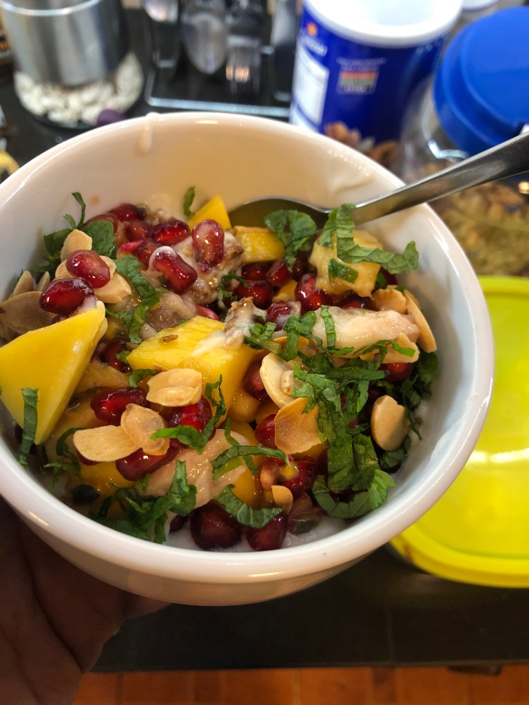 With yoghurt, toasted almonds, honey, oatmeal, a splash of orange juice