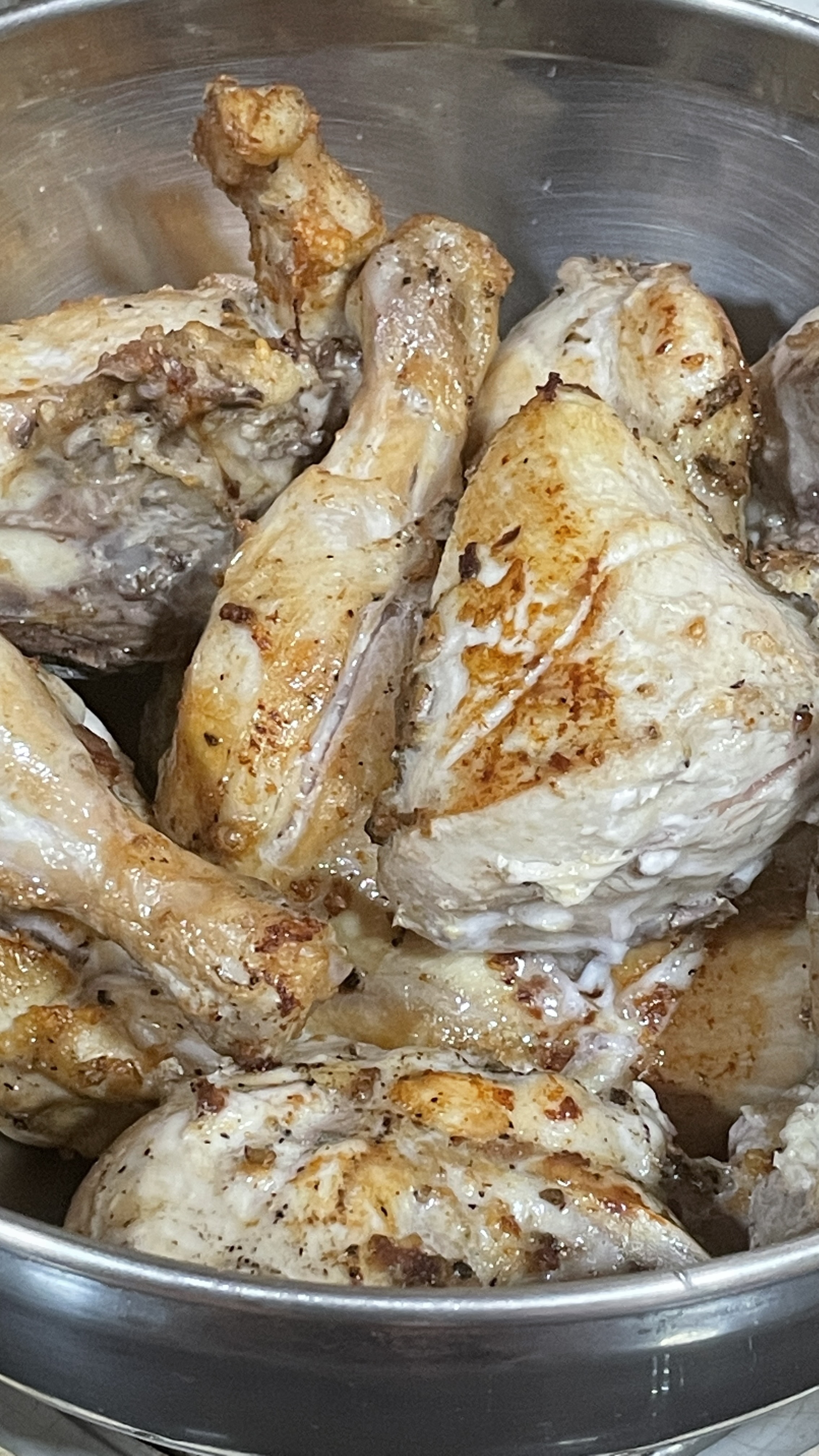 - Mélanger (2,5 poulets en morceaux sans peau) – laisser 24 heures au frigo