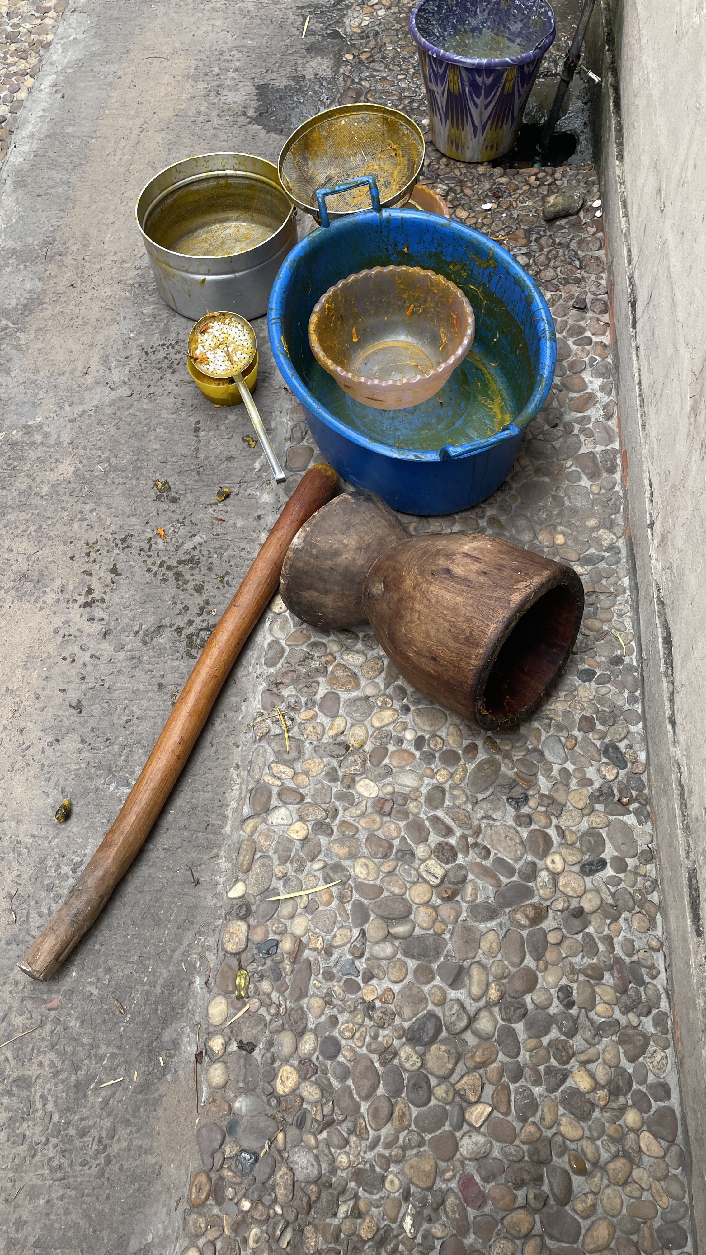 - Une fois bouillies, piller les noix de palme fraîches (10 kg de palme) dans un grand mortier et pillon (en bois) ou avec une technique similaire