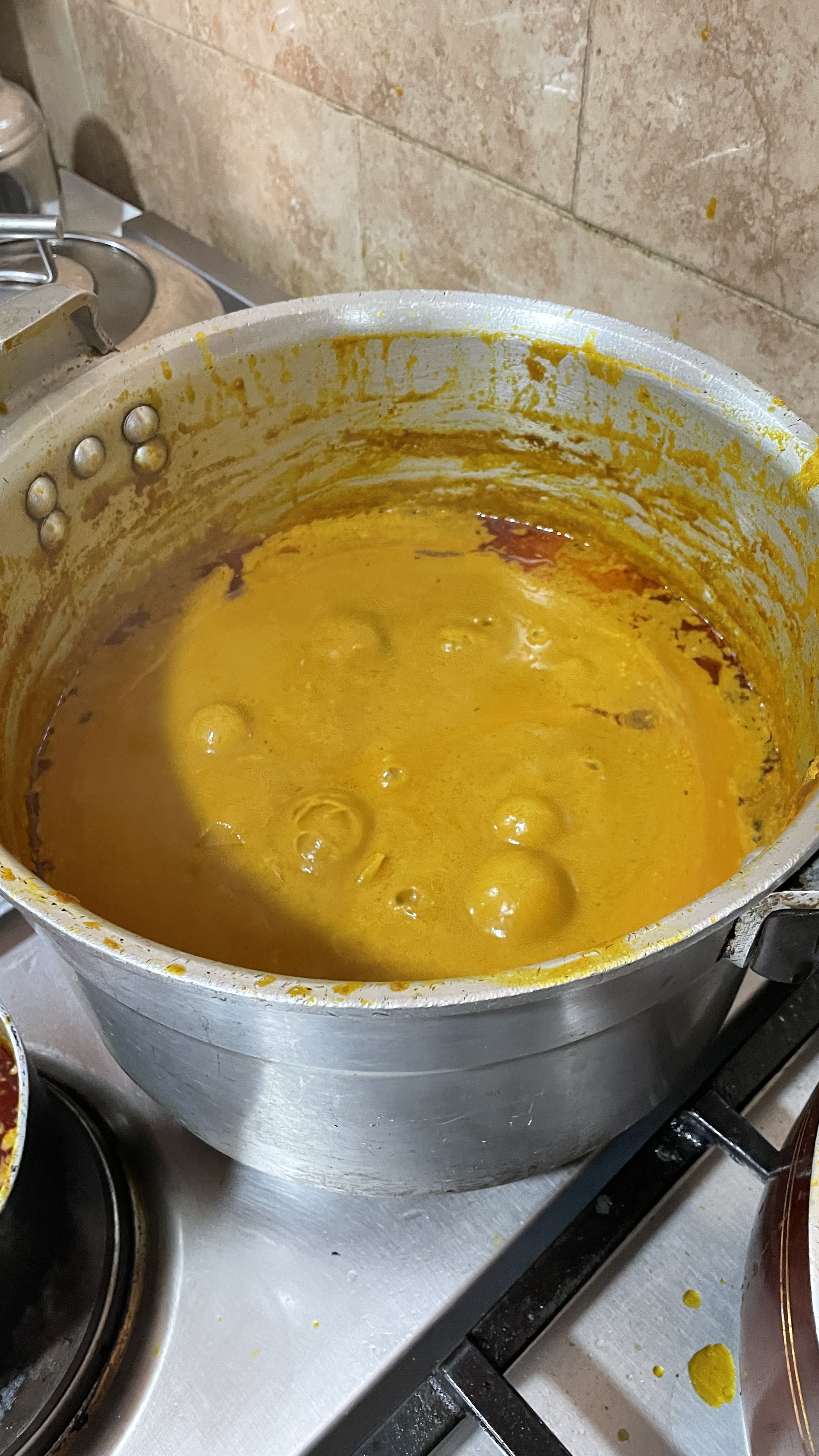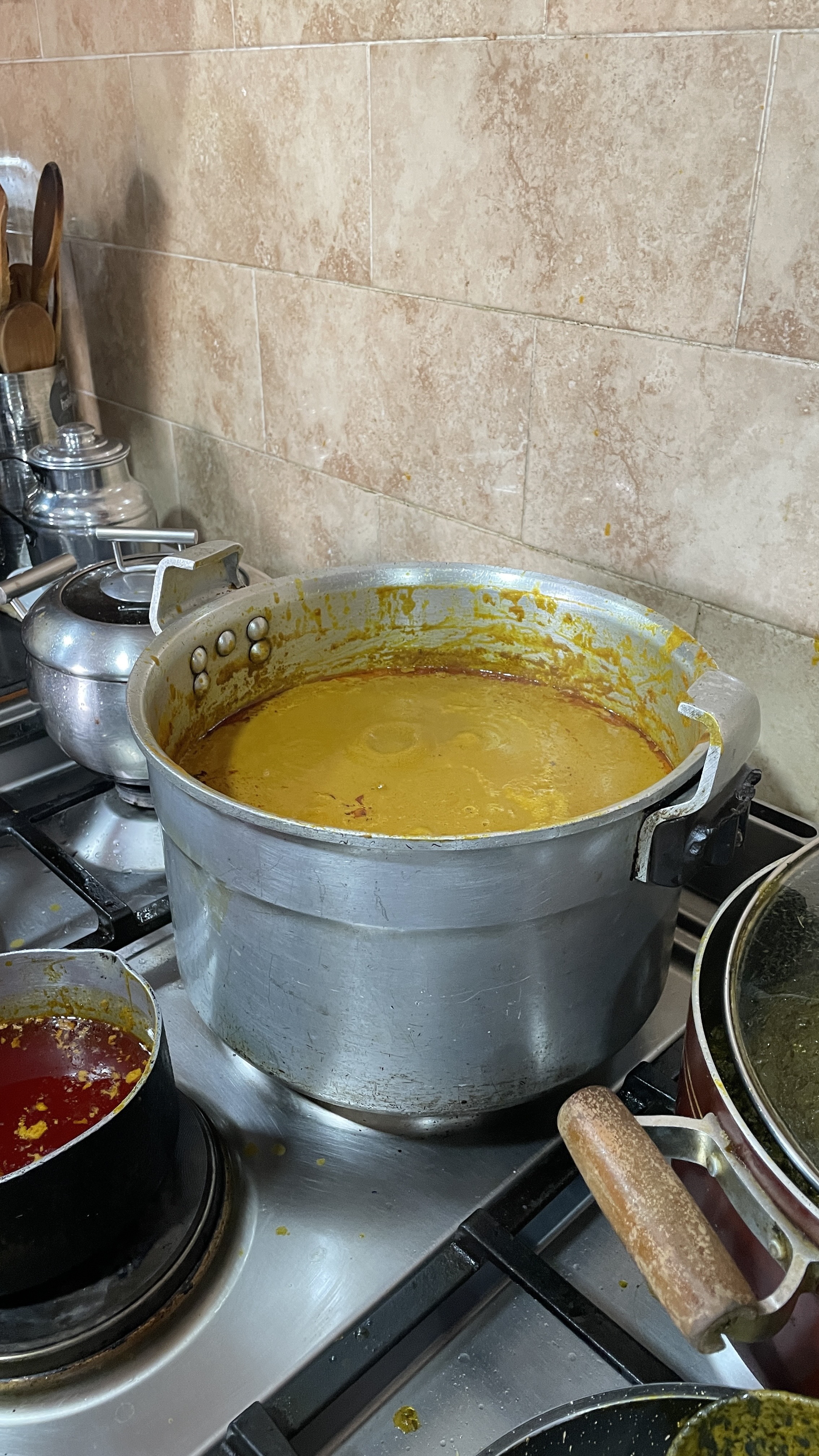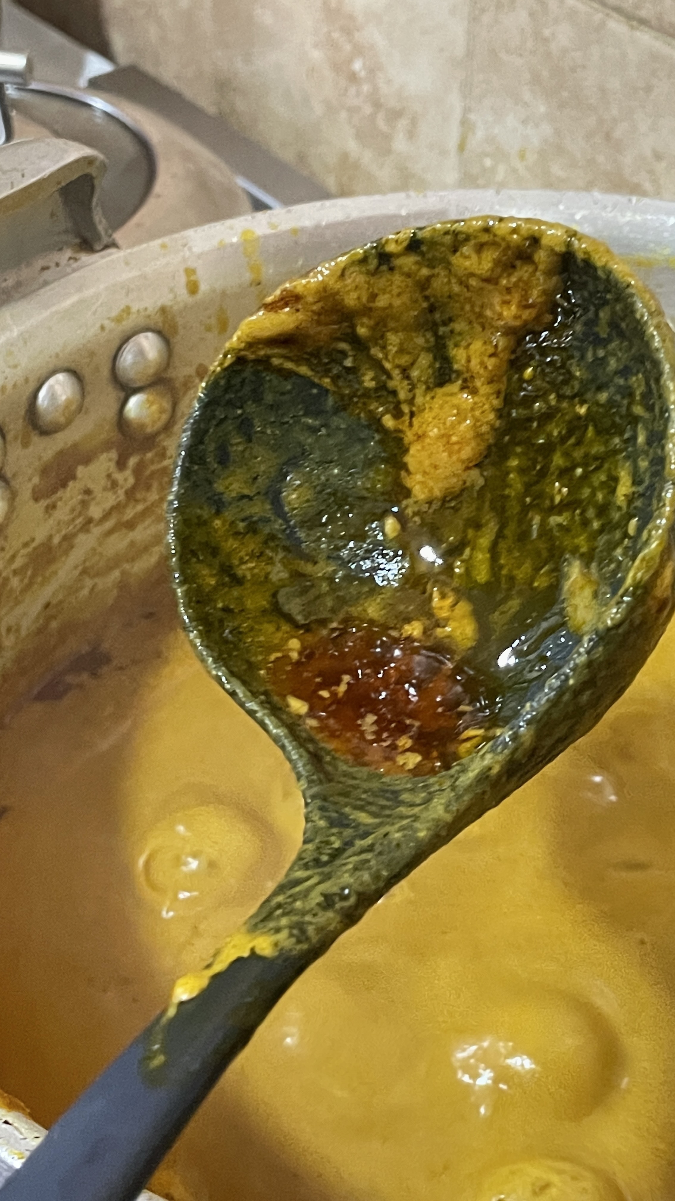 - Avec une cuillère à soupe, enlever l’huile de la surface de la sauce et réserver pour la préparation du sakasaka/manioc
