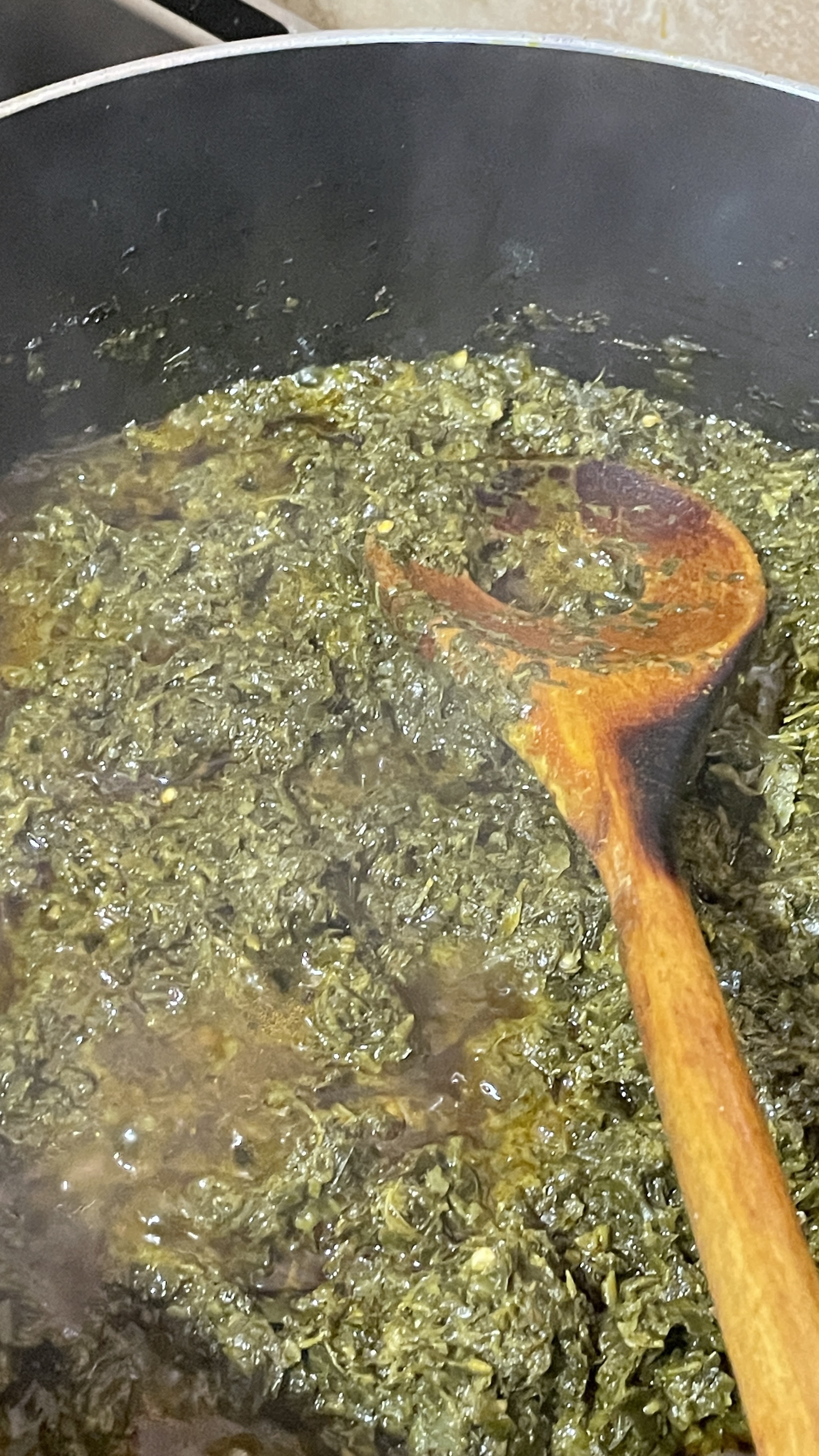 - Bouillir dans une casserole avec assez d’eau (quantité dépend du manioc) pour couvrir les feuilles pillées. Ajouter de l’eau si ça s’évapore trop vite. Attention à ne pas mettre trop d’eau!