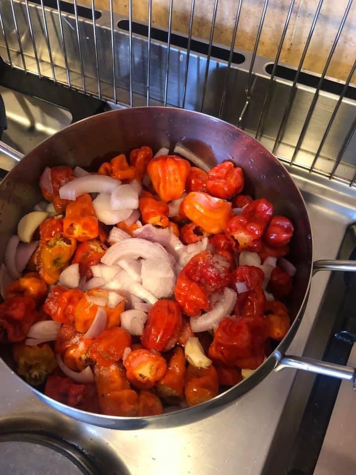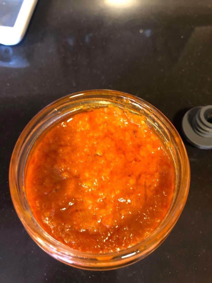 - Mettre le tout dans une casserole avec un peu d’eau et cuire jusqu’à ce que ça devienne une pâte épaisse (1 heure). Attention à l’odeur! C’est extrêmement piquant. Il ne faut absolument pas respirer l’odeur dégagée. Attention aux yeux aussi. Il faut bien aéré la cuisine.